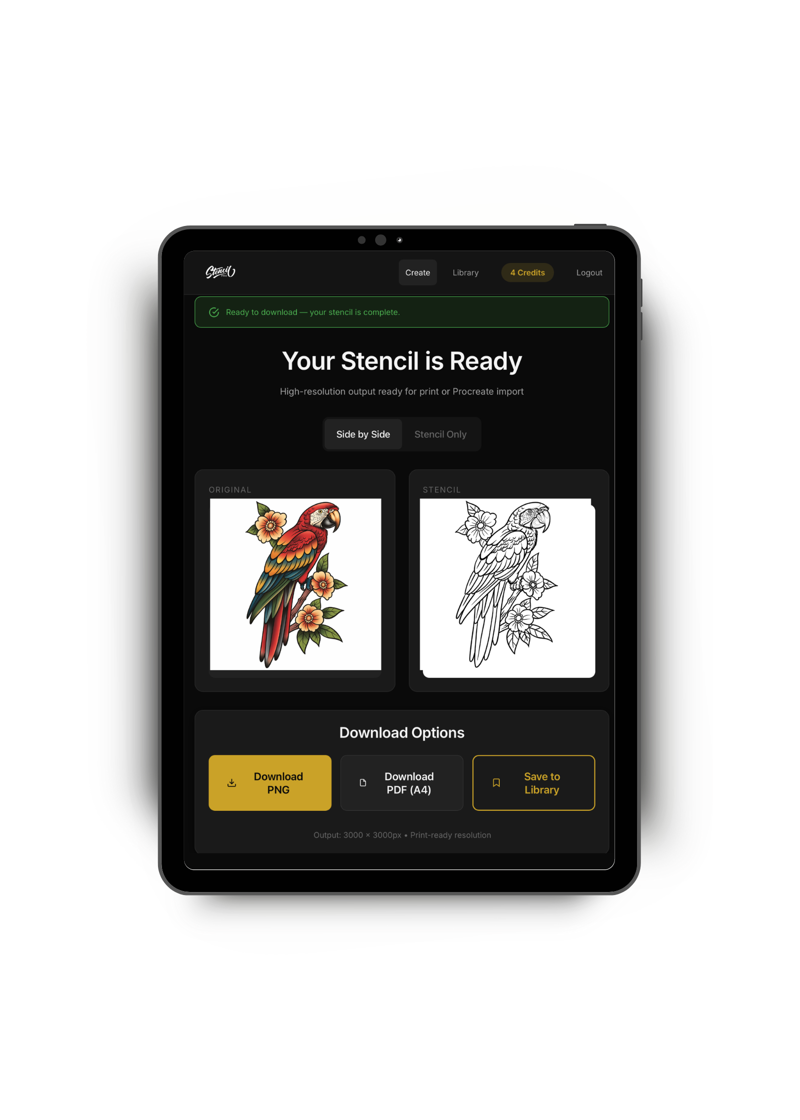 Save your stencil as a PNG or PDF and bring it straight into your iPad or printer. Fast. Sharp. Studio-ready.