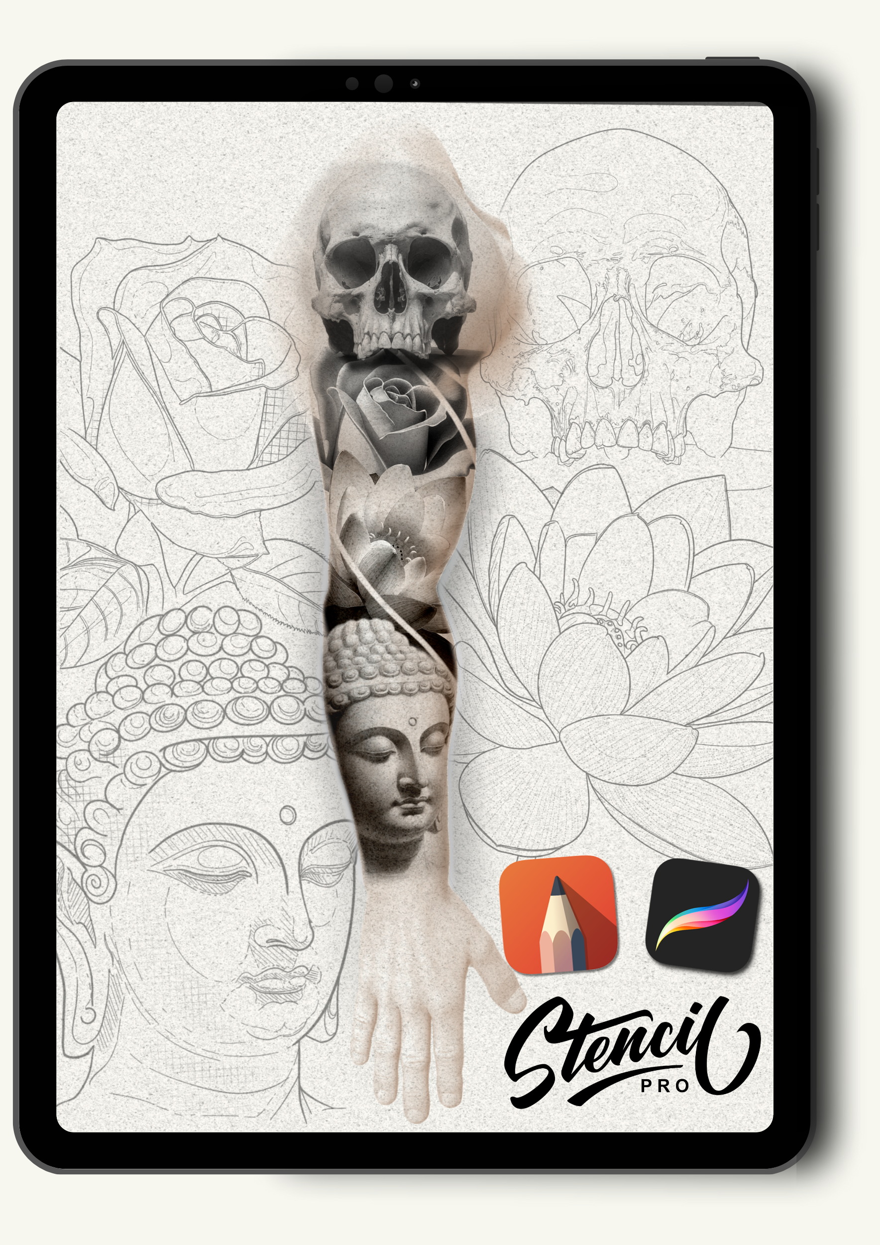 Whether you're working on floral, symbolic, portrait, or themed designs, this bundle covers it all. Ideal for both professional tattoo artists and apprentices, every pack is fully compatible with Procreate, Sketchbook (.skbrushes), PDF, and high-resolution PNG, so you can integrate them seamlessly into your workflow.