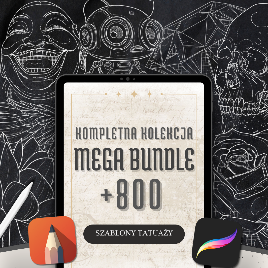 Wszystkie pakiety szablonów, flash stampy i style — połączone w jedną kompletną bibliotekę dla tatuatorów, którzy chcą mieć wszystko gotowe.