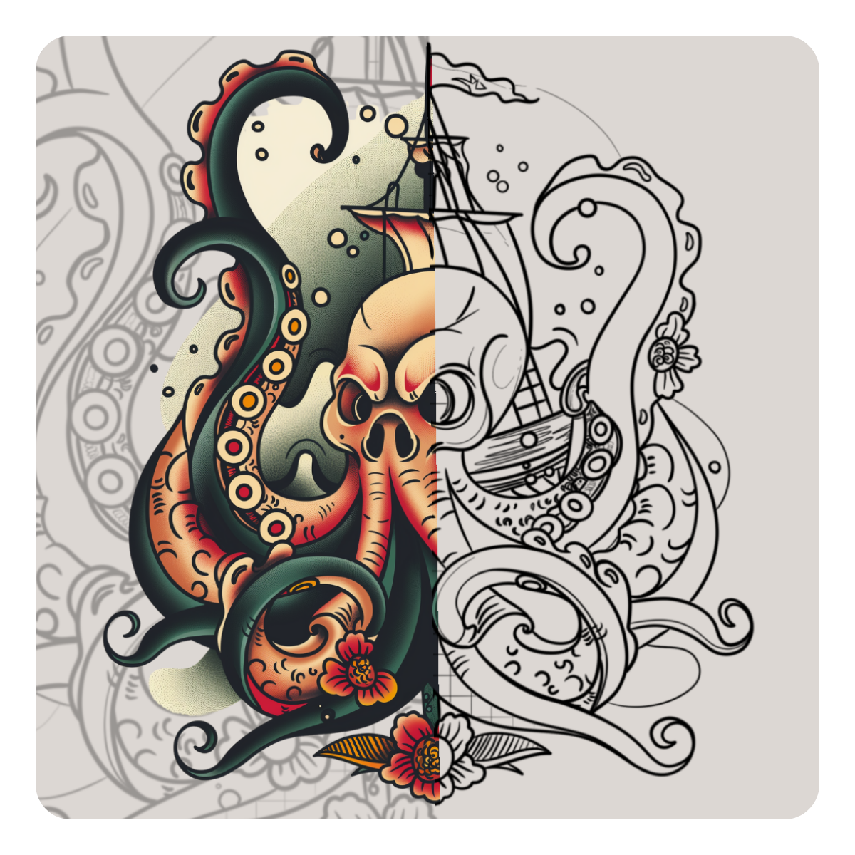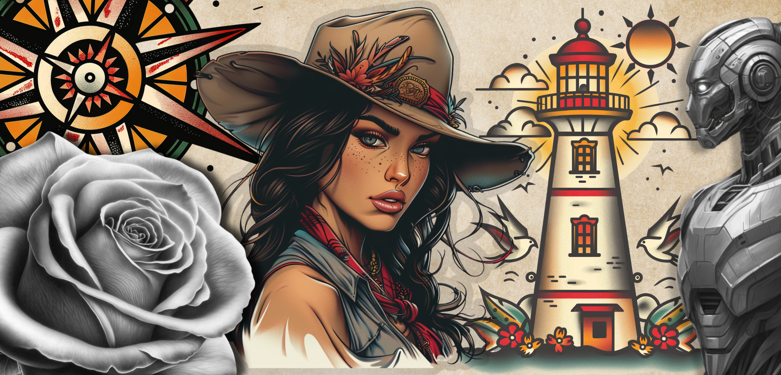 Stencils de realismo refinado, com nível de detalhe controlado e transições suaves de tons — desenvolvidos para assentar bem na pele e cicatrizar corretamente ao longo do tempo.