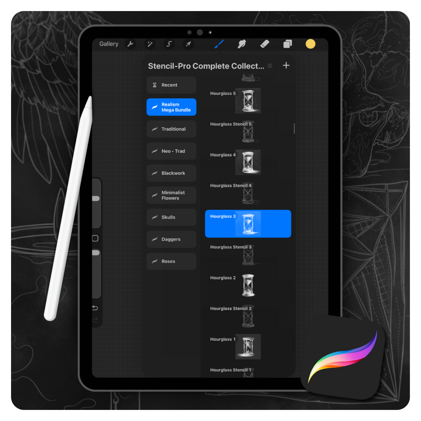 Esta coleção foi criada para artistas que trabalham digitalmente no Procreate ou Sketchbook, ou que preferem imprimir stencils limpos e precisos.