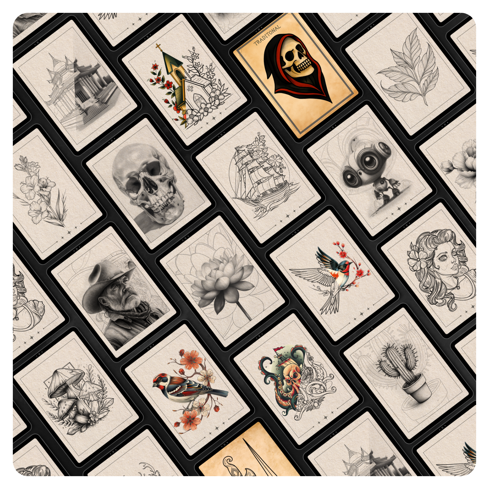 Designs marcantes e fáceis de ler, com estrutura forte — perfeitos para tatuagens clássicas, flash e composições atemporais.